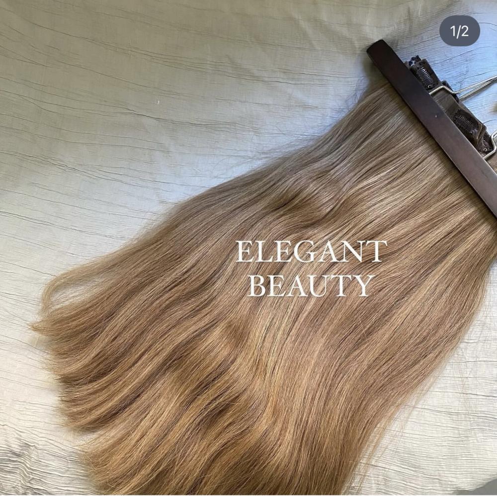 Natural hair extensionsHighlights (dark blonde with medium blonde highlights)Hidden clips5 piecesLength 18 inchesWeight 200 grams